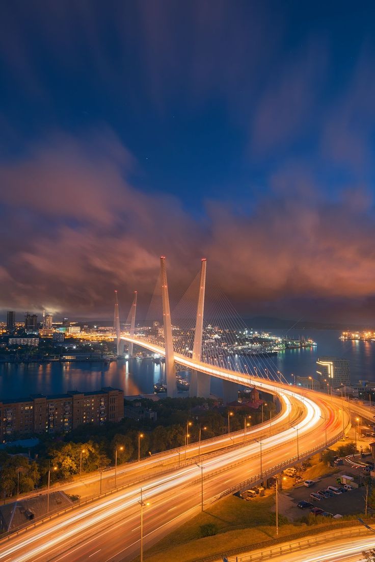 Был открыт в 2012 (к саммиту АТЭС). Это один из самых высоких мостов в России! Рассчитан на сейсмическую активность (до 8 баллов) и имеет 6 полос движения.
